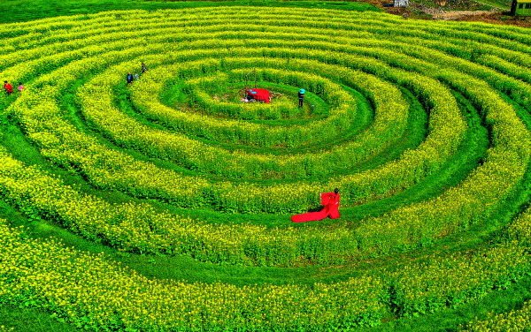 近日,万福路旁一片直径50多米的同心圆油菜花开得正艳,金灿灿的油菜花衬着绿油油的草地,引来众多游客打卡拍照。记者李凯 摄