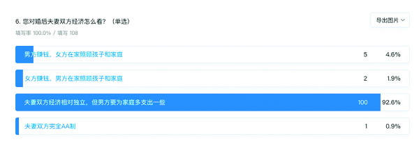 本报对108位市民就婚后家庭经济情况进行了调查。结果显示,92.6%的受访者认为“夫妻双方经济相对独立,但男方要为家庭多支出一些”,42.6%的受访者认为没必要藏私房钱,超九成受访者愿意借钱帮助遇到困难的双方亲戚。