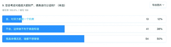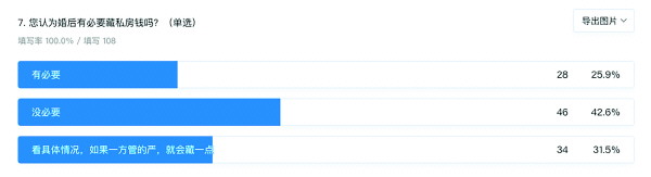 面对“您认为婚后有必要藏私房钱吗”这一问题,46人认为“没必要”,占比42.6%;34人选择“看具体情况,如果一方管得严,就会藏一点”,占比31.5%;28人认为“有必要”藏私房钱,占比25.9%。