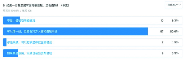 面对“如果一方亲戚有困难需要钱,您会借吗?”这一问题,87人选择“可以借一些,但要看对方人品和借钱用途”,占比80.6%;10人选择“不借,借钱容易还钱难”,占比9.3%;有9人甚至考虑“如果真是急用,没钱也会出去帮借钱”,占比8.3%;有2人选择“可以把手里存款全部借出”。