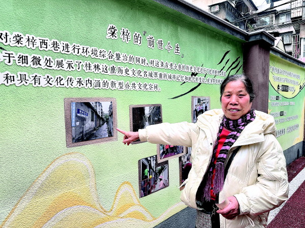 在对棠梓西巷这条百米小巷的改造中,重点挖掘“棠梓”文化元素,创新打造具有鲜明街巷特色文化标识和具有文化传承内涵的新型公共文化空间,以此来留住城市记忆。“棠梓为何意?”“棠梓西巷的由来”“工匠精神”等街巷文化都被一一印在墙上。文化墙还是特别的“夜光墙”,每个夜晚,在紫色灯光的照射下,墙上的桂林山水会发出特别的“荧光”。路过的市民都会被精美的壁画和神奇的夜光墙面吸引,不少年轻一代特意前来拍照、打卡,老旧小巷摇身一变成为了“网红巷”。