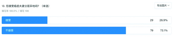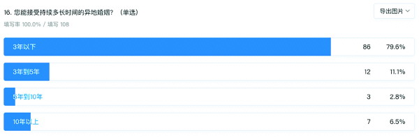 在本报的问卷调查中,关于“您能接受持续多长时间的异地婚姻”这个问题,108人中有86人认为自己“只能异地3年以下”,占79.6%,位列第一;12人选择“3年到5年”,占11.1%;3人选择“5年到10年”,占2.8%;7人选择“10年以上”,占6.5%。