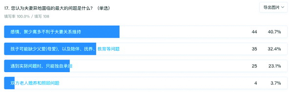 在本报的问卷调查中,关于“您认为异地婚姻面临的最大问题是什么”,108人中有44人选择了“聚少离多不利于夫妻关系维持”占40.7%,位列第一;35人选择了“孩子可能缺少父爱(母爱),以及陪伴、抚养、教育等问题”占32.4%,位列第二;25人选择了“遇到实际问题时,只能独自承担”占23.1%;4人选择了“双方老人赡养和照顾问题”占3.7%。