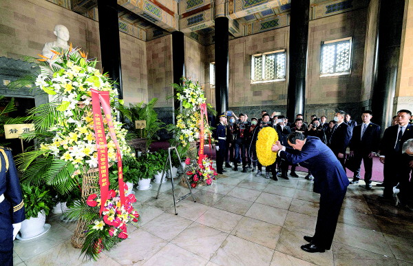 3月28日上午,中国国民党前主席马英九一行拜谒南京中山陵。这是在中山陵祭堂,马英九向孙中山坐像敬献花环。新华社记者才扬 摄