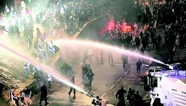 特拉维夫的抗议者封锁了一条主要高速公路,挥舞着以色列蓝白相间的国旗,并在路中间点燃了一堆篝火,刺鼻的黑烟直冲云霄,甚至遮蔽了附近标志性的摩天大楼。还有人聚集于内塔尼亚胡在耶路撒冷的私人住宅之外,与警方发生肢体冲突,警方随后使用高压水枪驱散人群。