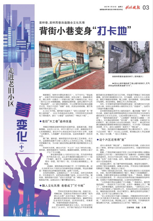 背街小巷变身“打卡地”   榕湖景区,桂林市内著名的景点之一,位于市中心“黄金地段”,这里不但有历经沧桑的古榕树,还有古南门、黄庭坚系舟处、湖心岛等一众景点……沿着古南门城门中轴线往北走,经过一段不过200米绿荫道路,就能到达棠梓巷,虽然占据市中心的“黄金地段”,出门就有美景相伴,中心区繁华的商业街也是触手可及,但这个片区的“房龄”很老,民居也非常密集,属于典型的开放式老旧小区。