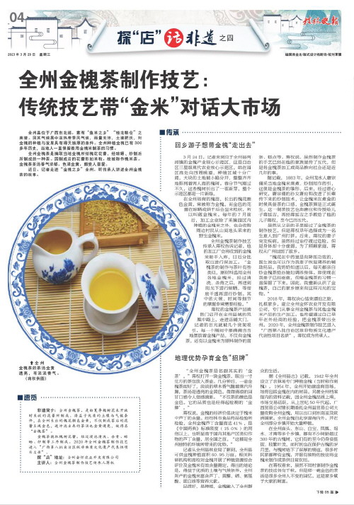 传统技艺带“金米”对话大市场   全州县位于广西东北部,素有“鱼米之乡”“桂北粮仓”之美誉。因其气候属中亚热带季风气候,雨量充沛,土壤肥沃,对金槐的种植与发展具有得天独厚的条件。全州种植金槐已有300多年历史,当地人一直保留着用金槐米制茶的习惯。