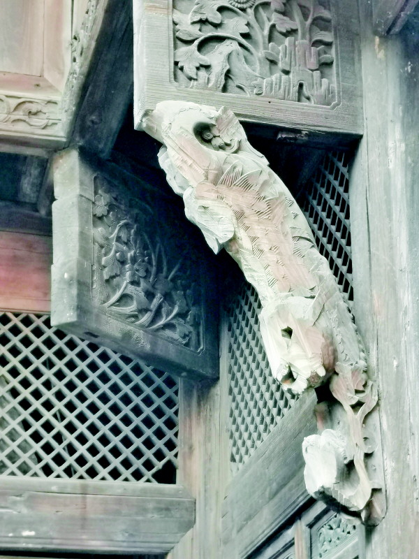 这座深宅大院,四水汇堂,虽内部的雕花门窗均已破旧不堪,但透过撑拱雀替上各种精致的花卉及人物乐居神山仙境的精细浮雕画面,不难想象出当年的豪华。门前墙壁上,还镶有两块拴马石,更是彰显出当年主人曾拥有的身份及辉煌。