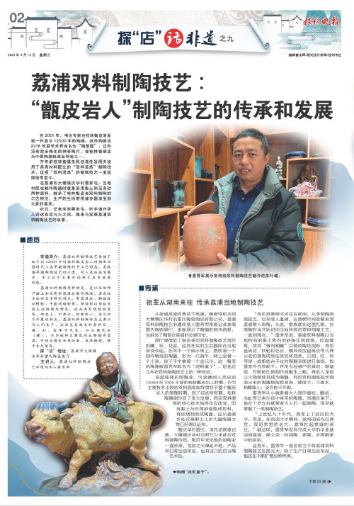 近日,记者来到荔浦市大塘镇庆华村雷家屯,听非遗传承人雷秀军讲述在泥与火之间,继承与发展荔浦双料制陶技艺的故事。●详见 2、3 版