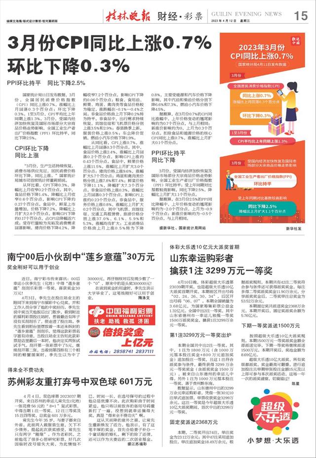 4月10日晚,体彩超级大乐透第23039期开奖,也是超级大乐透10亿大派奖首期开奖,本期前区开出号码“02、24、26、30、34”,后区开出号码“06、07”。本期全国销量为3.68亿元,为国家筹集彩票公益金1.32亿元。全国中出2注一等奖,其中山东省德州市一幸运儿独揽一等奖1500万派奖奖金,擒获1注3299万余元一等奖。
