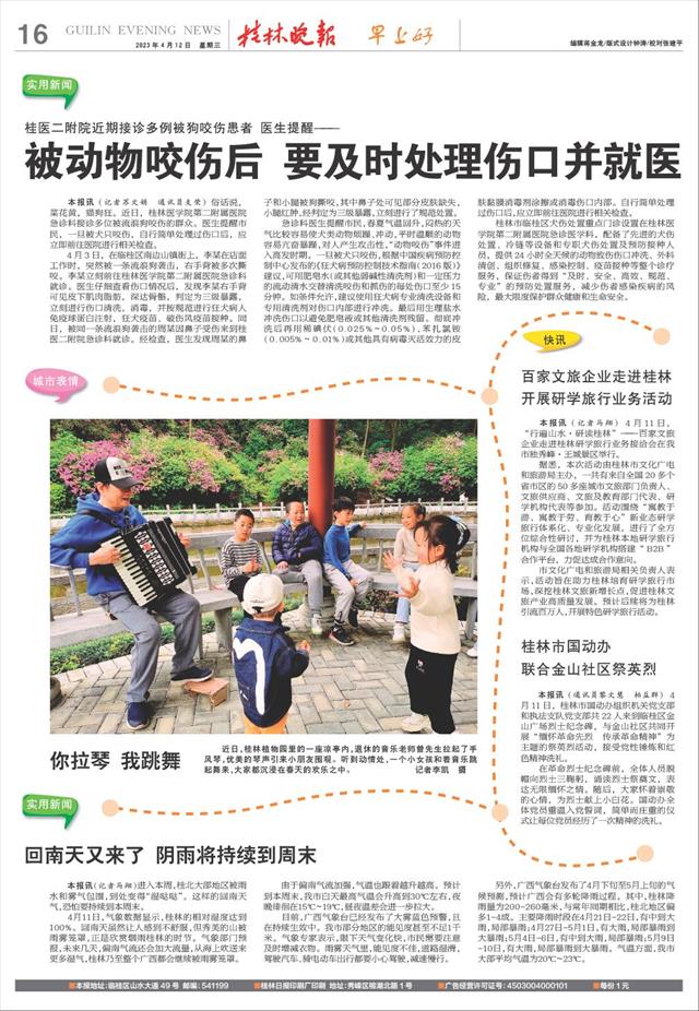本报讯(记者苏文娟 通讯员支荣)俗话说,菜花黄,猫狗狂。近日,桂林医学院第二附属医院急诊科接诊多位被流浪狗咬伤的群众。医生提醒市民,一旦被犬只咬伤,自行简单处理过伤口后,应立即前往医院进行相关检查。