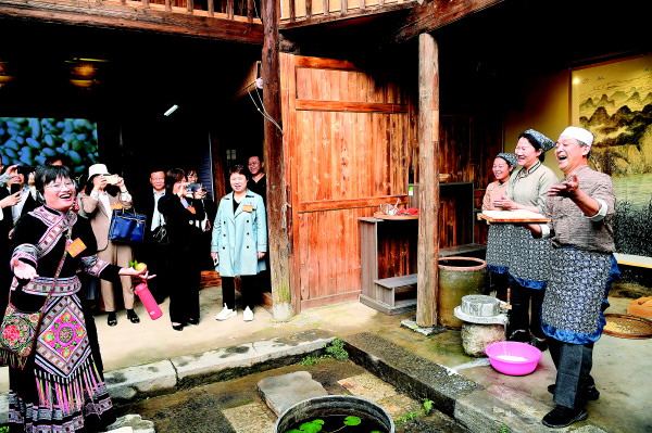 考察期间,与会人员在草坪回族乡潜经村雁山区政协委员活动中心,与表演回族水豆腐制作情景剧的艺术家们展开山歌互动。