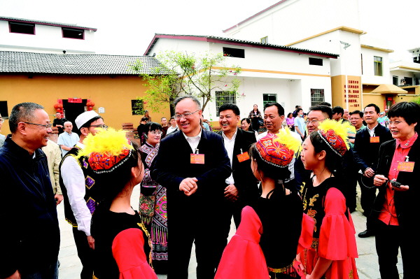 自治区政协副主席黄俊华等考察草坪回族乡潜经村,并与孩子们交流。