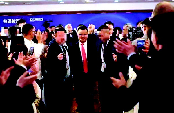 杨涛鸣被安保人员护送上台演讲。(资料图片)