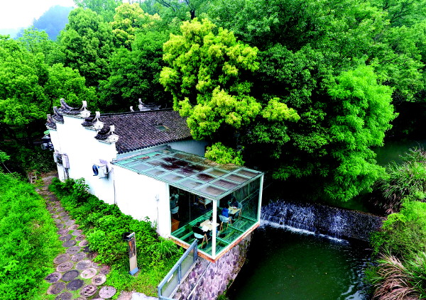 4月23日,市民在浙江省武义县俞源村古树林农家书屋阅读(无人机照片)。新华社发