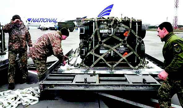 乌克兰军人在基辅的鲍里斯波尔机场接收一批美国对乌军事援助物资。(资料图片)
