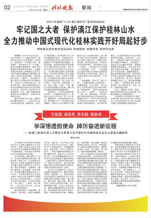 陈亮指出,今年是全面贯彻落实党的二十大精神的开局之年,是落实习近平总书记对广西“五个更大”重要要求、全面建设新时代壮美广西的起步之年,我们要牢记领袖嘱托,坚持以习近平新时代中国特色社会主义思想为指引,深入践行习近平生态文明思想,紧跟伟大复兴领航人踔厉笃行,厚植生态环境优势,推动绿色发展,以实际行动当好保护漓江、保护桂林山水的“二郎神”,切实呵护好大自然赐予中华民族的“宝贝”,全力把漓江打造成为国内江河综合治理典范和世界级生态保护样板,建设人与自然和谐共生的美丽桂林、壮美广西。