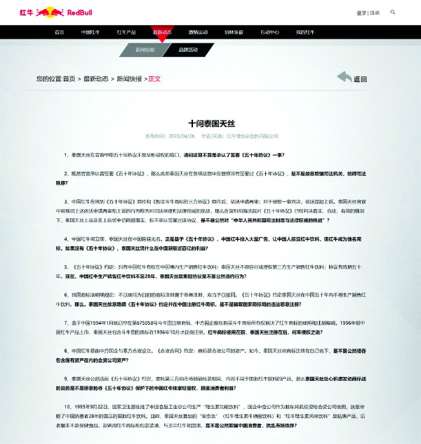 泰国天丝又于4月25日发布声明称“‘五十年协议’不是华彬集团实施侵权行为的借口”,中国红牛4月26日再次发布回应,“十问泰国天丝”。