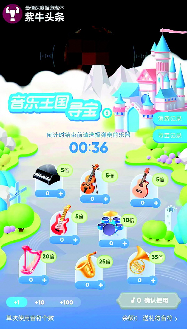 记者了解到,“音乐王国寻宝”游戏规则非常简单,游戏页面中出现钢琴、吉他等8种乐器,每个乐器旁标注有不同的倍数,游戏每隔一分钟会弹奏一种乐器,玩家事先下注并获得相应回报。单次下注使用“音符”进行,一个音符相当于2元,最高一次可以下4000注,也就是8000元。