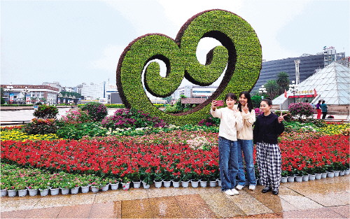 “五一”小长假将至,一个以“齐心协力建设家园”为主题的花坛在市中心广场设立。该花坛由市花木研究所设计,主体为心形,左右搭配树木造型,代表上下同心、齐心协力。花坛由一串红、万寿菊、何氏凤仙、超级海棠、绣球、月季、佛甲草等16800盆花卉组成,烘托出热烈喜庆的节日氛围,吸引了不少市民拍照留念。 记者唐霁云 摄