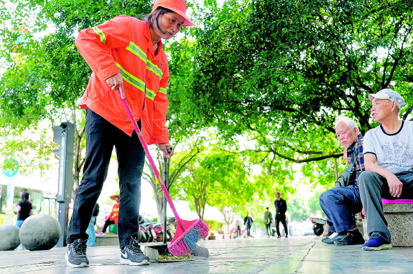 1日,中山路南门桥附近,环卫工人唐爱良在清扫路面,确保环境干净整洁。