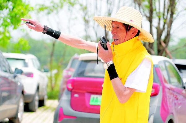 4月30日,雁山区柘木镇油麻滩,村民志愿者唐初息引导前来露营的游客停车。