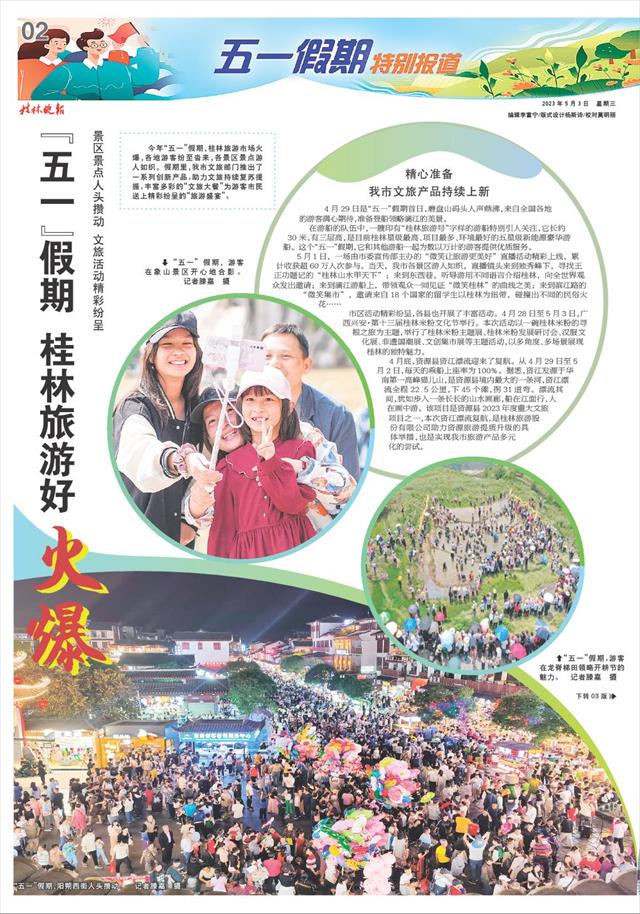 今年“五一”假期,桂林旅游市场火爆,各地游客纷至沓来,各景区景点游人如织。假期里,我市文旅部门推出了一系列创新产品,助力文旅持续复苏提振,丰富多彩的“文旅大餐”为游客市民送上精彩纷呈的“旅游盛宴”。