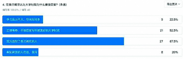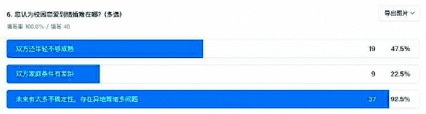 针对校园恋的问题,40位市民参与了本报设计的调查问卷,通过他们的选择数据结果,可以了解大家对校园恋的基本看法。