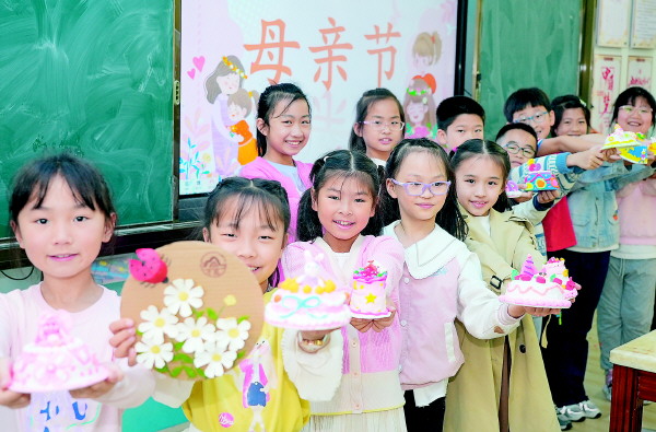 中隐小学的孩子们制作黏土蛋糕、手工花环等,为妈妈送上母亲节特别礼物。
