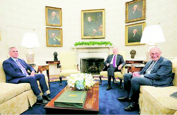 拜登5月9日邀约国会参众两院民主、共和两党领袖到白宫椭圆办公室会商债务上限问题。谈了大约1小时,没有取得进展,各方决定5月12日再次磋商。