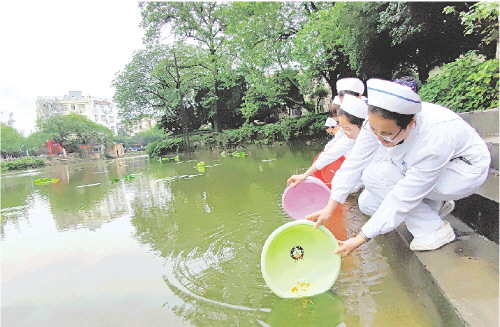 5月11日,广西壮族自治区南溪山医院护理部、团委组织医院优秀护士代表、青年志愿者等一行20余人,来到市象山区将军湖,与象山区政协二组委员代表、桂林弘吉祥国学馆工作人员共同开展“美化将军湖 爱我桂林城”鱼苗放生活动,通过放生3000尾鱼苗助力美丽桂林建设。通讯员张超群 摄