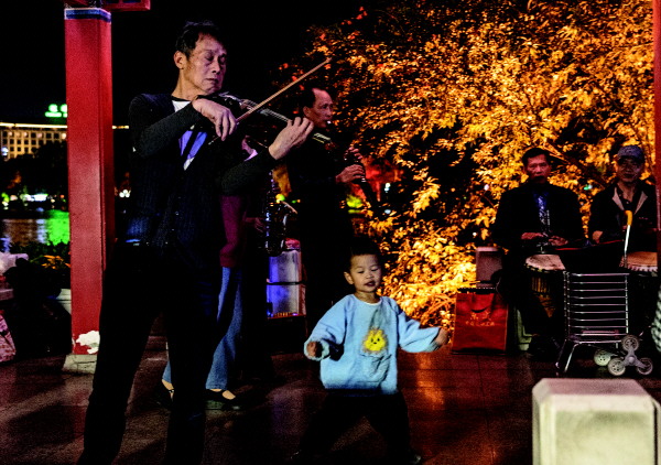 近日,几位市民在榕湖畔演奏经典曲目,一位小朋友随着音乐的节奏跳起舞来。记者滕嘉 摄