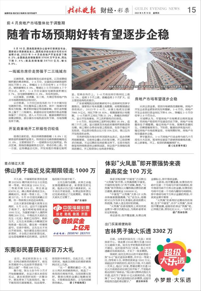 随着市场预期好转有望逐步企稳   5月16日,国务院新闻办公室举行新闻发布会,国家统计局新闻发言人、国民经济综合统计司司长付凌晖介绍,2023年1-4月份房地产开发投资下降6.2%。全国商品房销售面积37636万平方米,同比下降0.4%;商品房销售额39750亿元,增长8.8%。