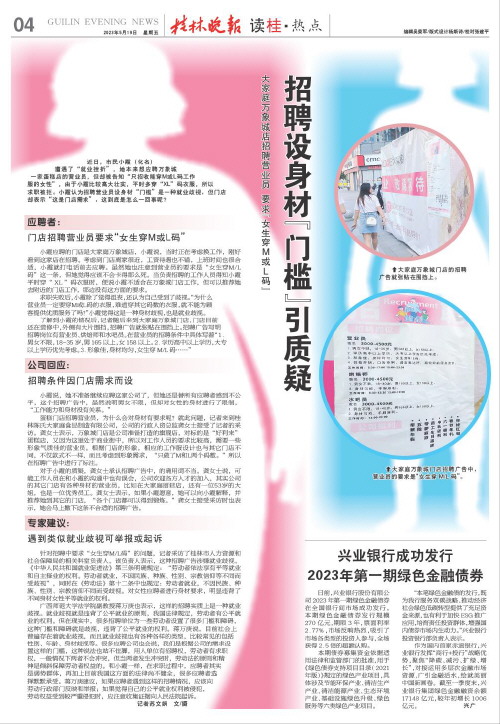 蛋糕门店招聘营业员,为什么会对身材有要求呢?就此问题,记者来到桂林陈氏大家庭食品制造有限公司,公司的行政人资总监龚女士接受了记者的采访。龚女士表示,万象城门店是公司准备打造的旗舰店,对标的是“好利来”蛋糕店,又因为这里处于商业街中,所以对工作人员的要求比较高,需要一些形象气质佳的营业员。根据门店的形象,相应的工作服设计也与其它门店不同,不仅款式不一样,而且考虑到形象需求,“只做了M和L两个码数。”所以在招聘广告中进行了标注。