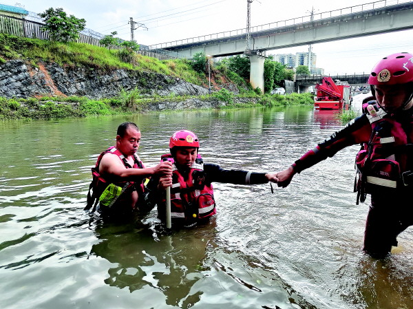 水塔社区的工作人员银剑首先赶到这里,此时一位老人已经站在水中,准备穿过道口去买菜,积水已经没过小腿。银剑一边喊一边脱鞋跑进水中,一把扶住老人,将老人慢慢带了出来。老人说,当时走到水中时,自己已经有点慌了,但一下子不知道是该前进还是返回,幸亏银剑及时赶到,将他扶了出来。