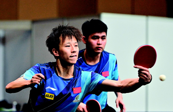 21日,林高远(左)/林诗栋在比赛中回球。新华社发