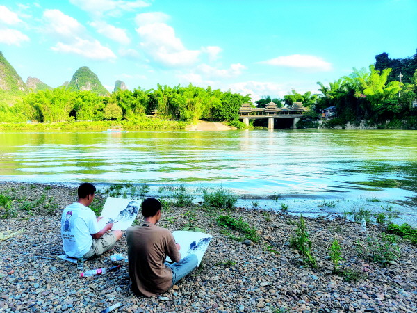 27日下午,在阳朔大桥附近的漓江边上,两位市民通过手中的画笔,趁着晴好的天气,描绘美丽的桂林山水。记者滕嘉 摄