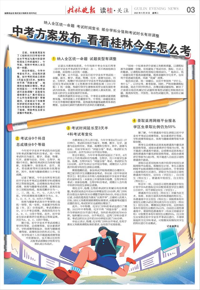 中考方案发布 看看桂林今年怎么考   日前,市教育局发布了《桂林市2023年初中学业水平考试与高中阶段学校招生工作的通知》,今年起,桂林中考纳入全区统一命题。