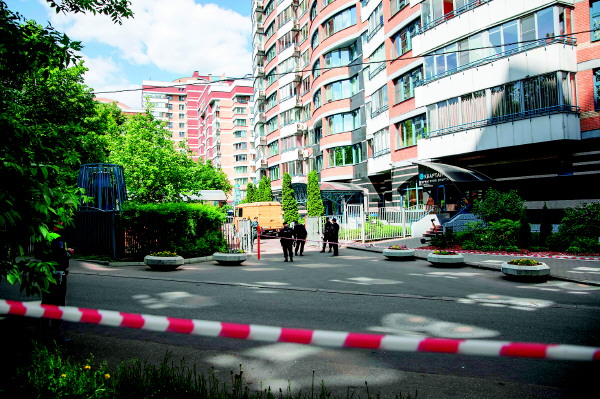 5月30日,警察在俄罗斯首都莫斯科的楼房遭袭现场警戒。新华社发
