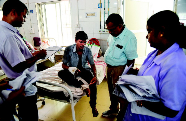 4日,事故的伤者在印度奥里萨邦巴拉索尔的一家医院接受医生检查。新华社发