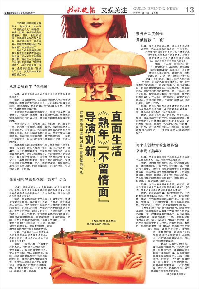 刘新:这的确是拍戏的不易:把矛盾推到极致,就觉得狗血,还原生活,会觉得压抑。但我认为不重要。《熟年》开局的确是生活不易的真实写照,而后续我们更想展开的是主人公如何突破自我,如何打破困局。我们想引领观众思考,怎么样选择才能风雨过后见彩虹,要相信生活,相信自己,相信家庭,相信亲人。