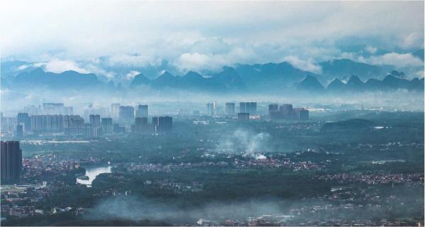 18日下午一场大雨后,桂林市区天空飘起雾气,城市的高楼和远处的山峰若隐若现,如同仙境一般。记者滕嘉 摄