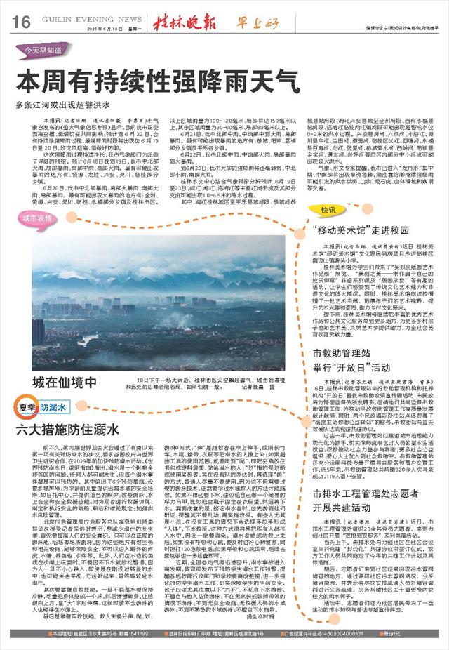 桂林水文中心结合气象预报分析预计,6月19日至23日,漓江、湘江、洛清江等主要江河干流及其部分支流可能出现1.0-6.5米的涨水过程。