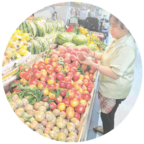 在枫林市场的一水果摊位,李子、桃子很诱人。