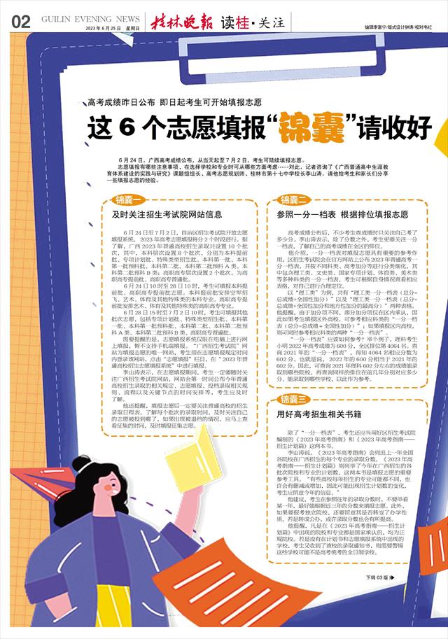 李山涛说,《2023年高考指南》会列出上一年全国各院校在广西招生的每个专业的录取分数,《2023年高考指南——招生计划篇》则列举了今年在广西招生的各批次院校和专业的计划数,这两本书是填报志愿的重要参考工具。“有些高校每年招生的专业可能都不同,也许会有删减或增加,因此可能出现招生计划数的变化,考生应留意今年的信息。”