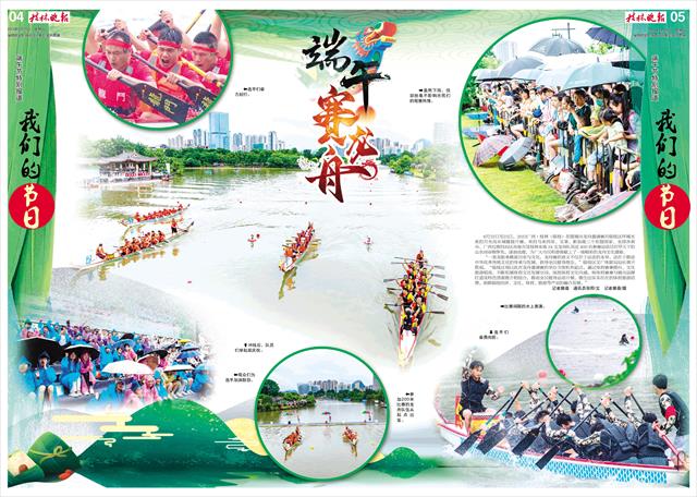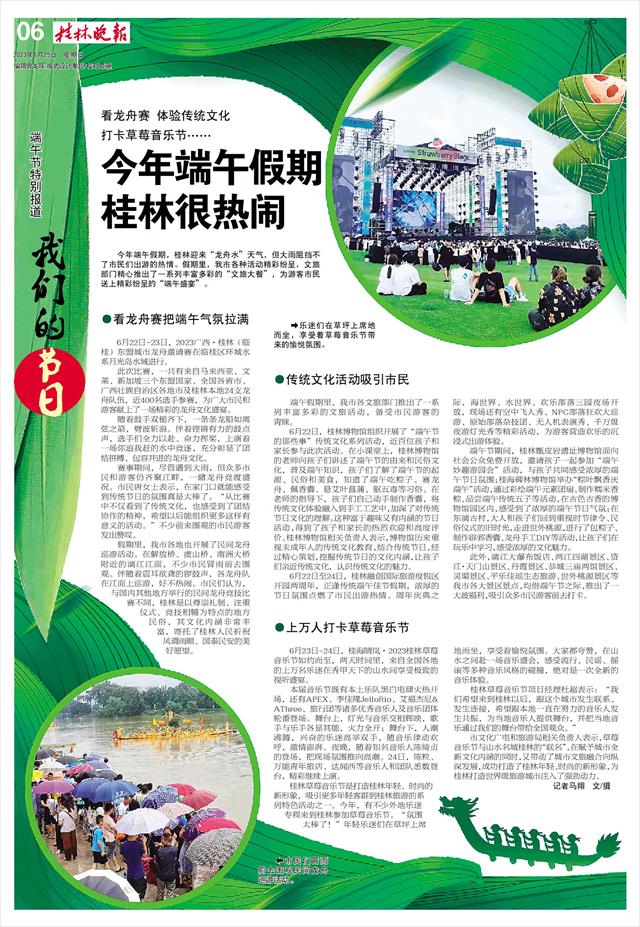 端午赛龙舟   端午假期期间,2023广西·桂林(临桂)东盟城市龙舟邀请赛在临桂区环城水系月光岛水域进行。来自马来西亚、文莱、新加坡3个东盟国家、全国各省市、广西壮族自治区各地市及桂林本地的24支龙舟队近400名参赛运动员在甲天下的山水间奋楫争先,逐浪竞渡,为广大市民和游客献上了一场精彩的龙舟文化盛宴。●详见 4-6 版