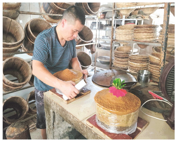 “松糕一般用糯米和粳米加黄糖水做,把两种米磨成粉加一点黄糖水拌成半干半湿的状态,一层一层地撒进专门的木头蒸桶里,最后再浇上一层黄糖糖浆,蒸一个小时熟透就好了。”秦润黎说,制作松糕的时候也可以根据客户的要求,在米粉中间加入荔浦芋头丁、肥肉等材料,味道更加浓厚丰富。
