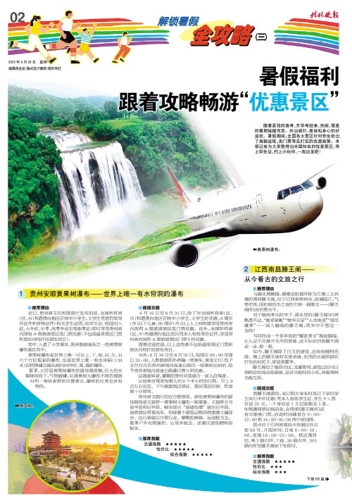 畅游“优惠景区”   今年暑假,全国不少景区针对学生给出了打折、免门票等优惠措施。本报记者为大家整理出全国知名的优惠景区攻略,快点约上小伙伴,一起出发畅游吧!