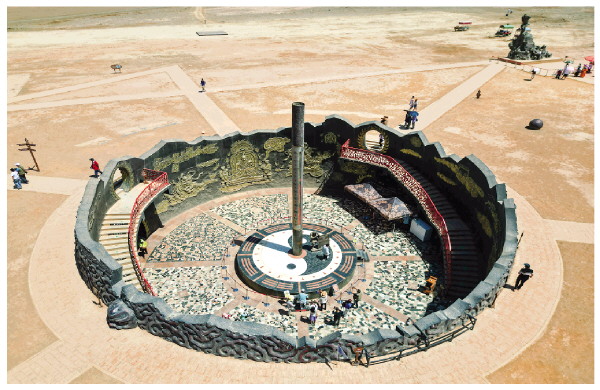 游客在位于吐鲁番市的火焰山景区游玩(6月27日摄,无人机照片)。巨型温度计显示当时火焰山景区地表温度约为65摄氏度。