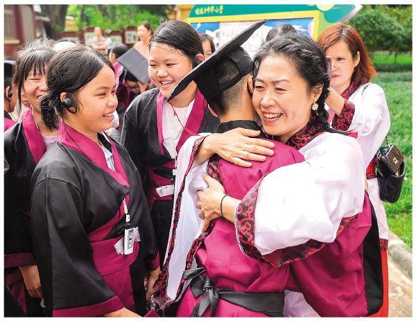 3日,中华小学六年级学生举行毕业研学活动。师生们一起走进靖江王城,共上最后一堂课,共游读书崖,毕业生向老师行传统谢师礼,师生们在浓厚的传统文化氛围中相互告别。图为师生们依依惜别的场景。记者李凯 摄